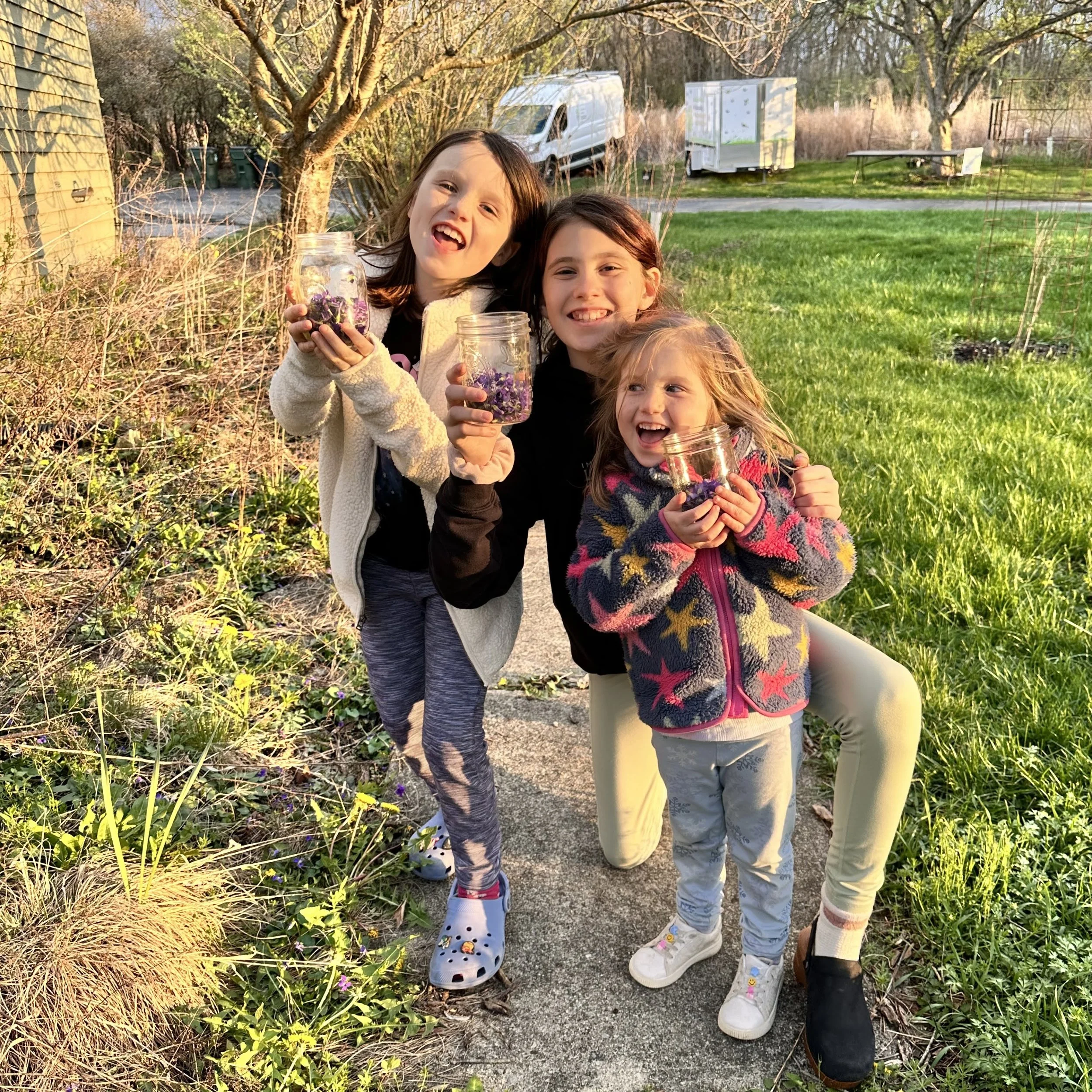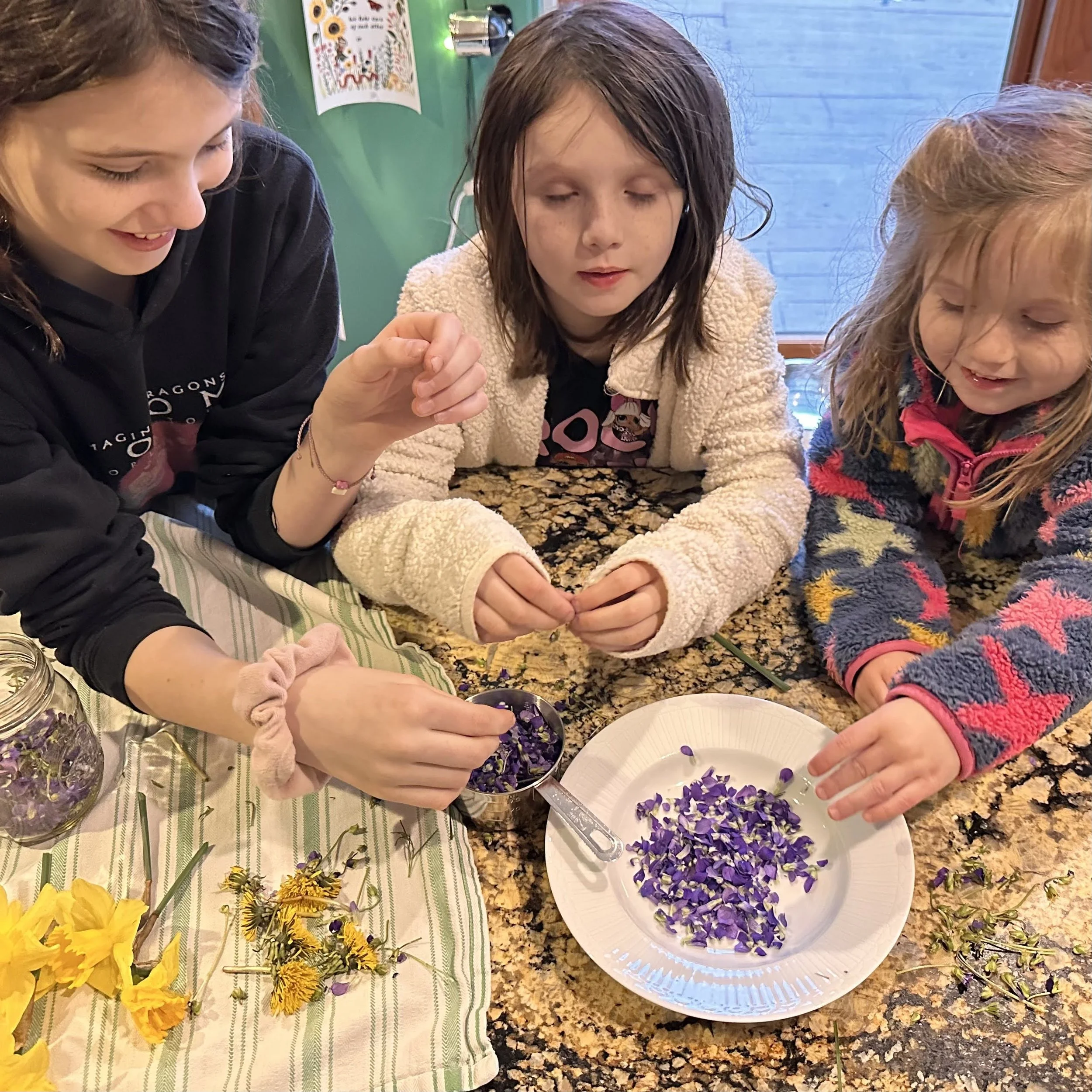 So, when the violets started blooming, they knew those were edible too and asked me what we could make with them. I pulled up a recipe from The Spruce Eats for a simple violet syrup. The girls were delighted to pick the flowers and separate the petals from the stems and calyxes. They had so much patience for this, I was really impressed. Then we filled the jar with the boiled water and waited 24 hours before adding sugar. They enjoyed the results over a bowl of vanilla ice cream (I was too busy preventing 3rd helpings to even get a photo!)
